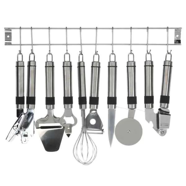 Set of kitchen utensils 9-part steel Kitchen set of steel 9 - partial. Extremely helpful in any kitchen. The set includes: hanger, can opener, pizza knife, whisk, cap opener, garlic squeezer, cheese knife, knife, peeler. Additional Information: 1 cap opener, 1 peeler, 1 knife, 1 cheese knife, 1 garlic squeezer, 1 can opener, 1 pizza knife, 1 whisk, 1 hanger, Material: stainless steel, Utensil length: 19-27cm, Tool rack length: 42cm, Usage: Food contact,