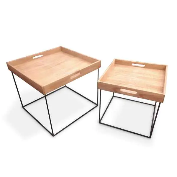 A set of metal tables with a wooden tray A set of coffee tables with a tray top on a metal frame covered with black varnish. The set is an ideal choice for any living space, where it will create a pleasant atmosphere. The tabletop is applied, made of teak wood and can act as a tray. Technical data: Color: Beige , Brown , Black Material: Teak wood , Metal Large table dimensions: height: 45 cm side dimensions: 50x50 cm Small table dimensions: height: 40 cm side dimensions: 42x42 cm