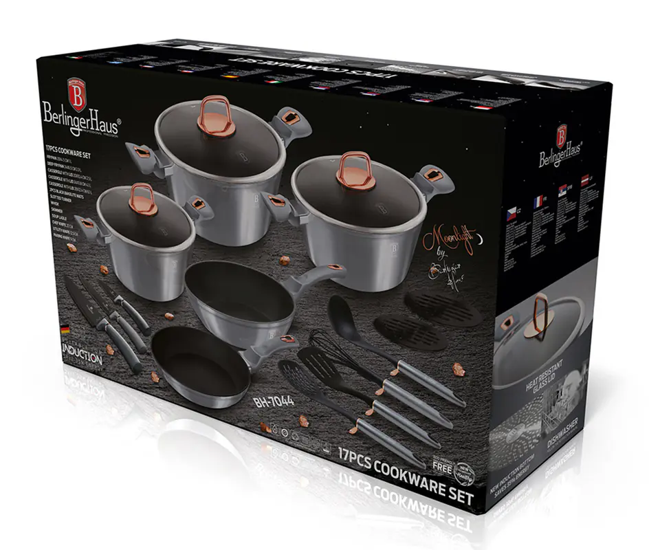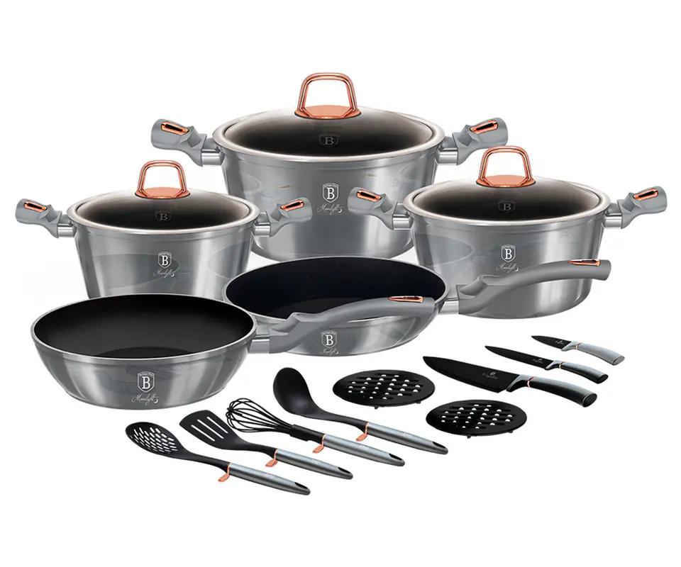 The POTS and accessories of the MOONLIGHT METALLIC series from BERLINGERHAUS are made of high-quality forged aluminium coated inside with a triple granite coating (marble) with a very high hardness coefficient. The outer shell is available in several color versions with a characteristic metallic sheen. These attractive and fashionable dishes are equipped with SOFT TOUCH handles (silicone handle) as standard. Suitable for all types of cookers: gas, electric, ceramic, halogen, induction. The TURBO INDUCTION system (they heat up very quickly) can save up to 35% of energy.