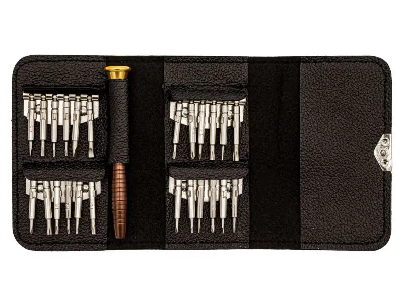 Practical set of 24 tips along with a professional-looking handle. The whole was enclosed in a handy case. It is a set that we can use in the service or take it with us to the airport, outdoors, etc. It will be useful when servicing smartphones, laptops, watches, etc.