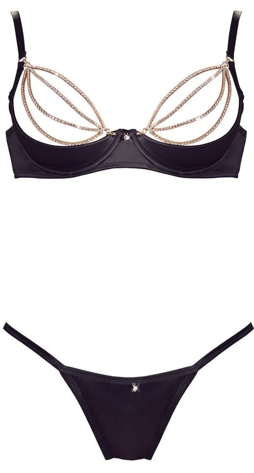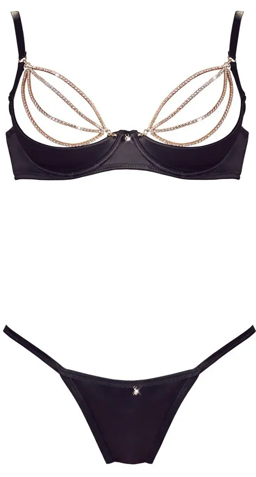 Beautiful luxurious set of underwear made of velvety soft satin. A slightly padded shelf bra surrounds the breasts with three gold-colored rock crystal chains on each breast. The thongs were also decorated with 3 chains of rock crystals above the buttocks. All chains are detachable.