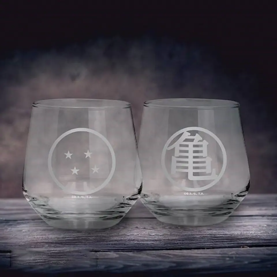 Elegant glasses containing elements of the Dragon Ball universe with the Kame symbol and a 4-star dragon ball.