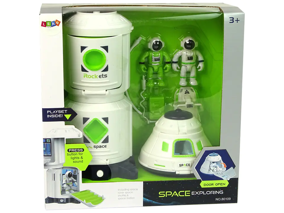 The rocket is powered by two 1.5 V AA batteries (included), the capsule is powered by two LR44 1.5 V batteries (included). All elements of the cosmic set are made of high-quality material, i.e. plastic. The toy is CE certified , packed in a large cardboard box decorated with a cosmic motif.