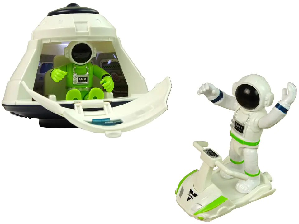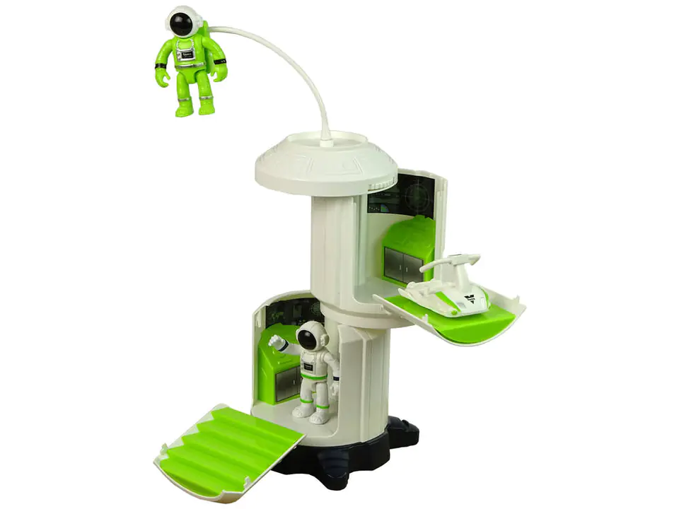 A rocket-like space station is like an astronomer's second home. In the middle there is a mapped space station, a control point. The whole station is movable and consists of two parts. By moving to the side, we see its interior. The walls are full of graphs, a control panel that realistically shows the parameters and location of aliens. Inside, the astronomer's figurine will easily fit. From the upper room, you can set off to admire and explore the cosmos using a spacecraft. At the bottom of the station there is a button that activates sound and light functions such as beeping sounds and red light coming from inside.