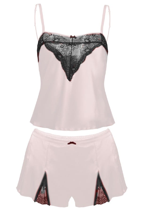 SATYNOWY KOMPLECIK W KTÓRY SKŁAD WCHODZI KOSZULKA ORAZ SPODENKI. GÓRĘ KOSZULKI ZDOBI DELIKATNA KORONKA NA DEKOLCIE. RAMIĄCZKA CIENKIE I REGULOWANE. DOSTĘPNE WERSJE KOLORYSTYCZNE:SATYNA JASNY ECRU Z ECRU KORONKĄ, RESZTA KOLORÓW SATYNY Z CZARNĄ KORONKĄ