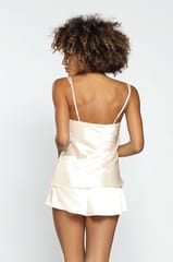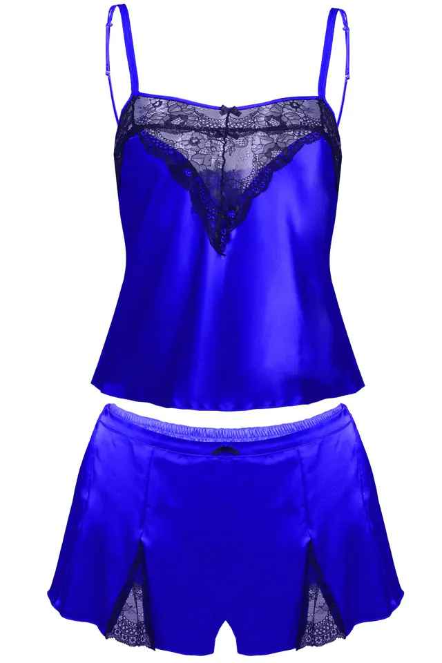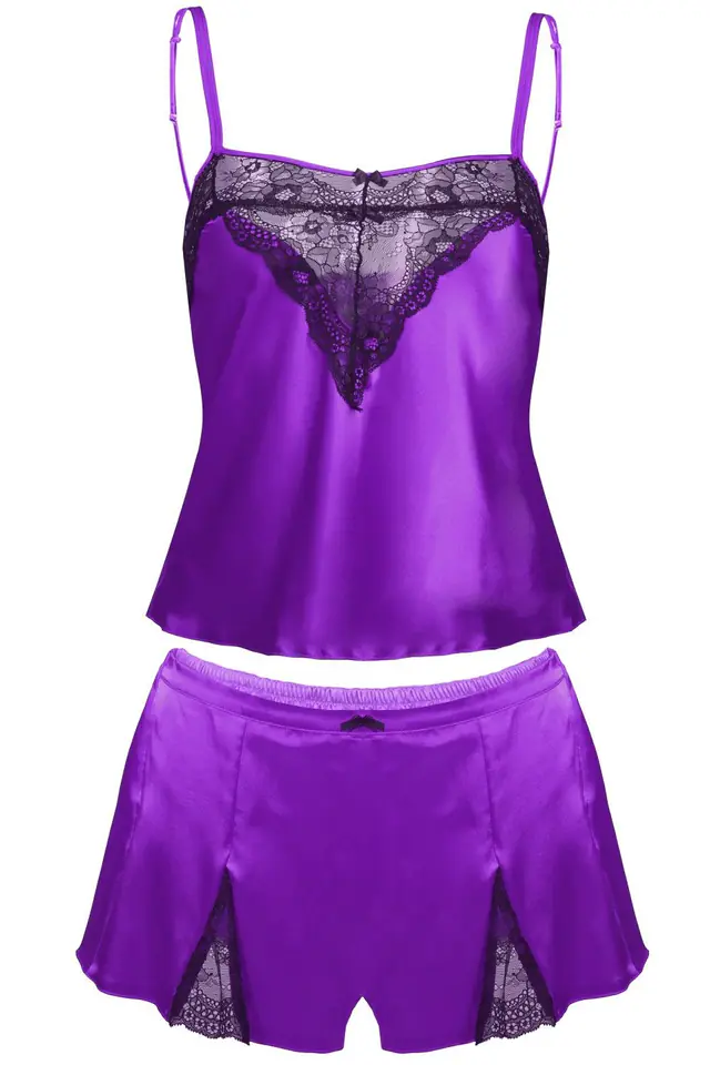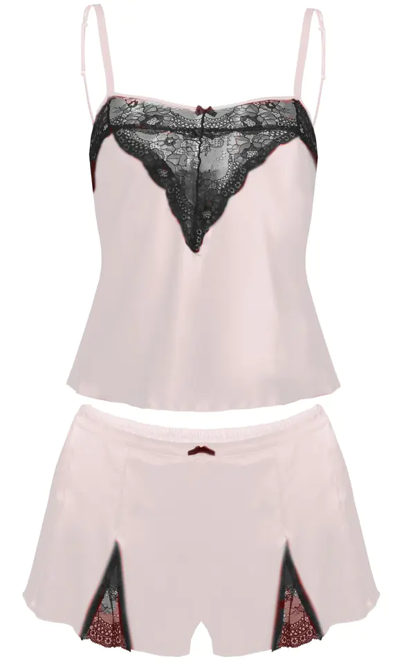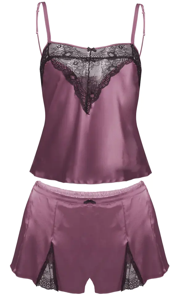 Cute satin set with lace accents. Blouse on delicate straps, with a decorative neckline. Looser cut at the bottom, does not wrap the tummy. The shorts have a top finished with a flat, comfortable tunnel and a flat elastic band, which at the same time adds charm and increases comfort. Legs with lovely lace. Composition: 100% polyester.