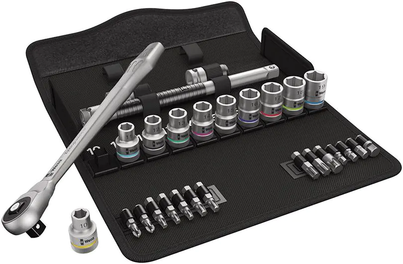 Execution: Chrome vanadium steel tools. Metal ratchet made of chrome-molybdenum steel, forged. Very narrow, with a long lever for good access in confined spaces and for the transmission of high torques, the ball retainer ensures a secure seat of the cap. Small weight for increased mobility, high strength. Delivered in a compact textile pouch that protects sensitive surfaces.