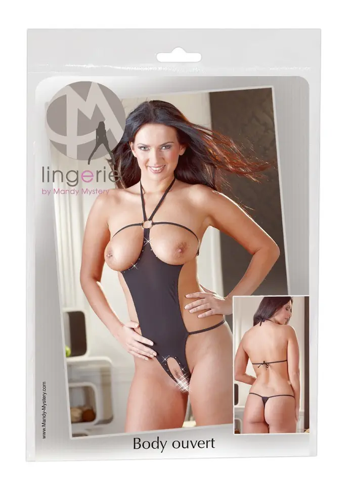 Sexy one-piece body with exposed breasts and an open crotch decorated with rhinestones. Tied at the back. Black. 85% polyamide, 15% elastane.