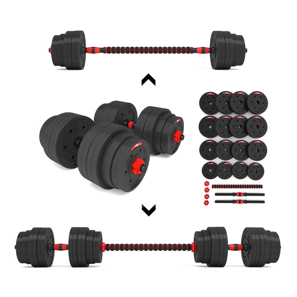 A dumbbell with a replaceable load is a classic, and at the same time a must-have for every home gym. It can not miss SGP40 HMS, a set of two composite barbells, which additionally have the ability to connect, thanks to which we get a barbell. The combination of high quality materials guarantees high durability, and thus the possibility of using the equipment for years. Clamps and perfectly matched diameter of the disc hole facilitate quick load change, and at the same time a reliable and constant arrangement on the neck. The clamps are threaded, thanks to this, the load does not move in any way during exercise. Thanks to a special extension, we gain the ability to combine two short necks into one long one. This innovative solution significantly expands the range of practice possibilities. We gain a barbell with which we will perform exercises that are impossible or uncomfortable, to perform with dumbbells. Deciding on one product, as a result we get two. The set includes two griffins, four clamps, connecting two necks and a total of 16 weight plates. The product is suitable for both advanced and novice users. Start exercising today, SGP40 HMS is the perfect proposition for a home gym. Specification: Material: PVC+cement, iron, foam Neck dimensions: Length: 51 cm Diameter: 25 mm Handle diameter: 33 mm Joining dimensions: Length: 41.3 cm Handle diameter: 43 mm Disc dimensions: 3 kg – 22.3 x 4.1 cm 2.5 kg – 21.3 x 4 cm 1.25 kg – 17.5 x 2.9 cm Neck weight: 414 g Joining weight: 431 kg Clamp weight: 14 g Total set weight: 41 kg Set includes: Short neck x 2 Joining two necks x 1 Plates 3 kg x 8 Plates 2.5 kg x 4 Plates 1.25 kg x 4 Clamps x 4 Notes: Not intended for commercial use Warranty 24 months