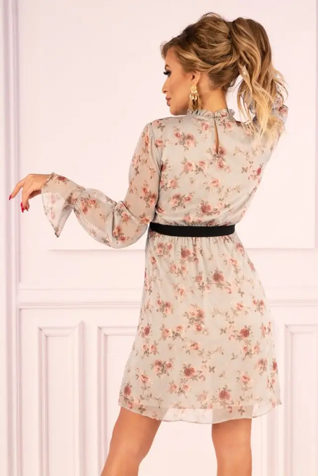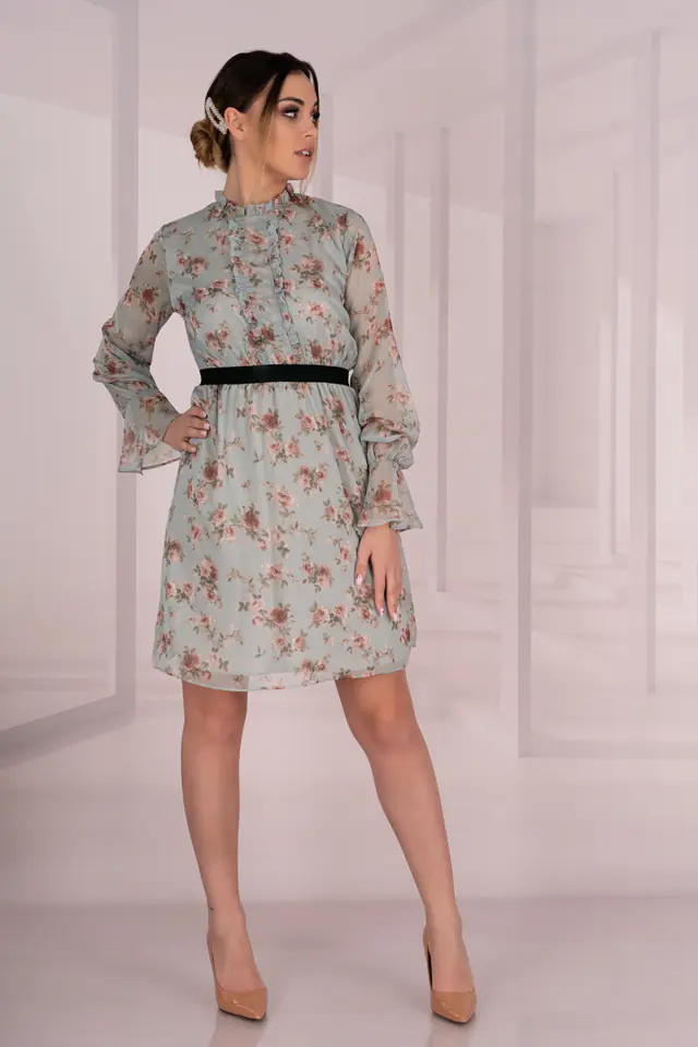Impressive, mint dress made of delicate, airy fabric with flowers. On a comfortable lining, long sleeves, decoratively finished at the wrists. Neckline with mini frill, built-up. Composition: 95% polyester, 5% elastane.
