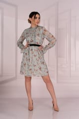 Impressive, mint dress made of delicate, airy fabric with flowers. On a comfortable lining, long sleeves, decoratively finished at the wrists. Neckline with mini frill, built-up. Composition: 95% polyester, 5% elastane.