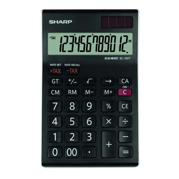 This 12 digit Sharp EL-124T Calculator has large raised buttons that make it very easy to use. It features 3 digit punctuation, two key roll over, an easy-to-use tax add or remove function and a grand total function that will calculate the accumulated totals of all the calculated values. This calculator is so easy to use due to the large, slanted LCD display.