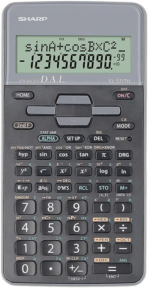 The EL531TH performs over 273 advanced scientific functions and utilizes a 2-line display and Multi-Line Playback to make scientific equations easier for students to solve. It is ideal for students studying general math, algebra, geometry, and trigonometry. In addition, it can be used for statistics, biology, chemistry, and general science. Hard cover protects from scratches.Basic DescriptionDisplay Type 2 linesNumber of Display Digits 10Power Source BatteryBattery Type AAA x1Automatic Power Down yesKeys PlasticProtective Case yesDimensions 161 x 80 x 15 mmWeight 115 gMathematical FunctionsBuilt-In Functions 273Entry System Algebraic (D.A.L.)1/x, x2, square root, % yesPi Key yesGCD, LCM noQuotient and Remainder Calculation noFractions yesFunction Table noEquation Solver (Newton) noSystem of Linear Equations noMatrix and Vector Calculations noNumeric Derivative and Integral noComplex Number Calculation noTraining (DRILL) Function noMemoryMulti-Line Playback yesLast Answer Recall (ANS) yesMemory Variables 9Notation and Decimal PlacesFSE Display (SCI, FIX, ENG) yes3-Digit Punctuation yesStatistics1-Variable Statistics yes2-Variable Statistics yesRegression Calculations 6Mean, Standard Deviation yesnCr, nPr, n! yesRandom Numbers yesTrigonometric FunctionsDeg, Rad, Grad Modes yesSin, Cos, Tan, and Inverses yesHyperbolic Functions yesSexagesimal and Decimal Conversions yesRectangular and Polar Coordinates Conversions yesNumber SystemsBin, Pen, Oct, Hex, Dec yesLogical Operation (AND, OR, NOT, NEG, XOR) yesScientific FunctionsMetric Conversions noPhysical Constants no