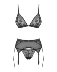 Komplet Shibu to zmysłowa bielizna dla kobiet, które cenią wyrazisty styl i perfekcyjne dopasowanie. Czarna koronka z geometrycznym wzorem efektownie układa się na ciele, akcentując kształty i przyciągając spojrzenia. Biustonosz z regulowanymi ramiączkami i kilkustopniowym zapięciem gwarantuje wygodę oraz możliwość precyzyjnego dopasowania.