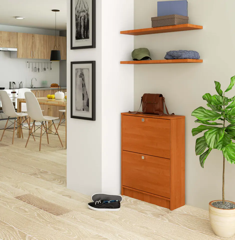 The 80 cm high and 60 centimeters wide cabinet is made of durable laminated board, which is extremely resistant to scratches. Two capacious drawers opened tiltingly manage to accommodate from a few to a dozen or so pairs of shoes. This is a practical solution that will be appreciated by people who care about order, who want to organize their shoes. The locker is available in our online store at a very favorable price. Easy to clean, opened in a practical way, an elegant cabinet will be a great complement to any hallway, as well as a wardrobe.