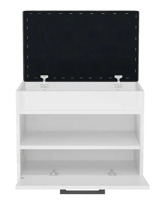Comfortable shoe cabinet with upholstered seat and storage for gadgets. The cabinet has a hinged door behind which there is a shelf.