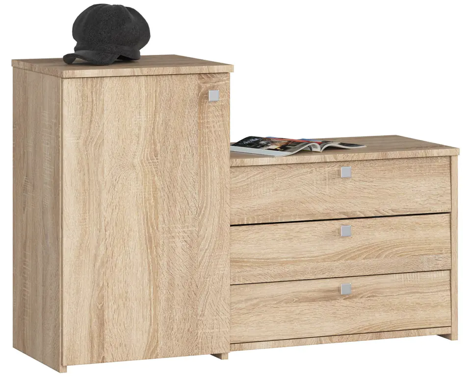 This is a high quality standing shoe cabinet in Sonoma oak color. It was made of high-quality Kronospan laminated board with ABS veneer edges, providing protection of the furniture against damage. The thickness of the board is 16 mm. The shoe cabinet is equipped with three shelves with hinged doors that will successfully accommodate many pairs of shoes. In addition, this cabinet is connected to a chest of drawers equipped with a door, having one shelf inside. This significantly increases the functionality of the shoe cabinet and allows you to place additional footwear or other necessary accessories in the dresser. Shoe cabinet s16 oak sonoma can be placed in the hallway, wardrobe, vestibule or staircase. Dimensions of shoe cabinet s16 sonoma oak: length - 98.4 cm; height - 68 cm (chest of drawers), 43 cm (shoe cabinet); depth - 33 cm. Door handles in the shape of a cuboid, silver color. Cabinet designed for self-assembly. All components needed for assembly are included.