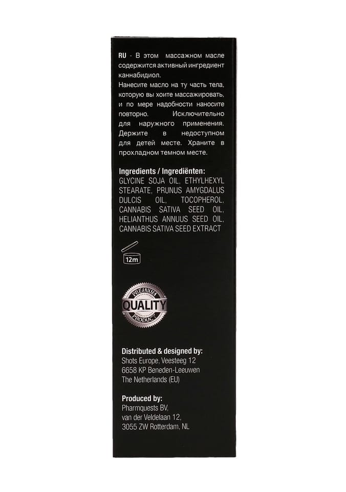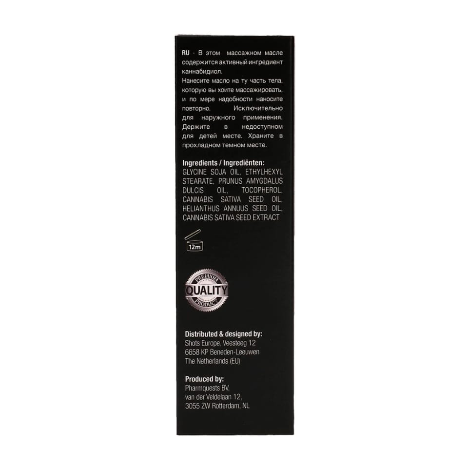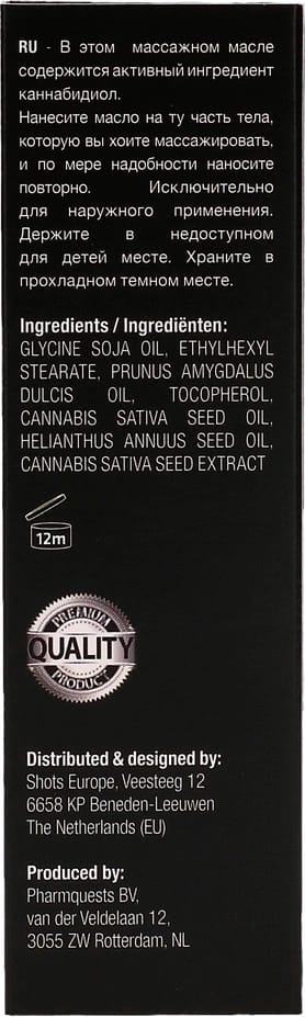 This massage oil contains the active ingredient CBD (cannabidiol). Apply the oil to the body part you wish to massage and repeat as and when needed. Exclusively for external use. Keep out of reach of children. Store in a cool, dark place.