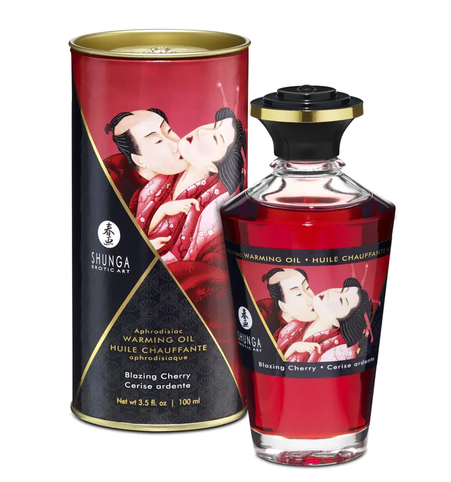 Warming, edible oil for intimate areas with cherry flavor by Shunga. It was made without the use of parabens, gluten and sugar. Sweetened with saccharin. Suitable for use with products made of latex and silicone toys. The oil is easily washed off the body using warm water.