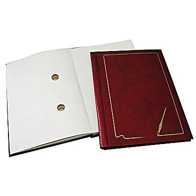 Hard cover, bound in PVC coated veneer. Covered ridge. Block of dyed cardboard. Contains 20 cards with 2 holes.