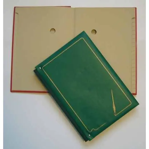 Hard cover, framed in PVC-coated veneer, with a sponge. Harmonica back. Connecting the cover with the block reinforced with rivets. Block of dyed cardboard. Includes 20 cards with 2 holes and side corridor