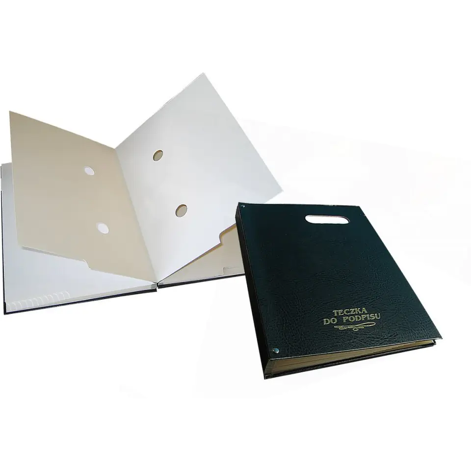 Signature folder with window Warta_- hard cover wrapped. Harmonica back. Connecting the cover with the block reinforced with rivets. On the front cover there is a window with a glass under which inscriptions can be placed. _- A block of cardboard dyed in mass contains 20 cards with 2 holes and cut registrami_- sales unit 1 piece