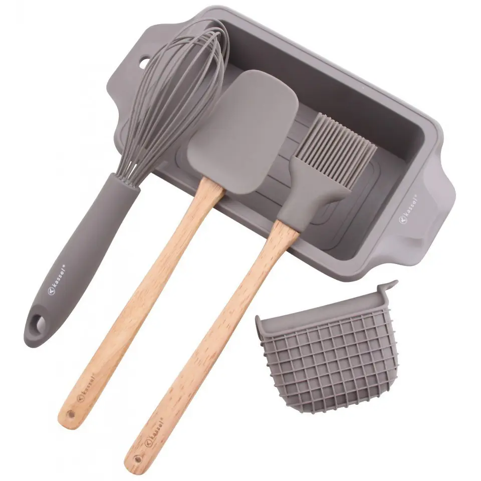 Set for baking dough or bread. Made of high quality silicone resistant to temperatures up to 210 degrees.C and natural acacia wood.