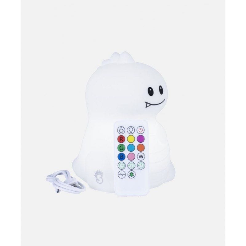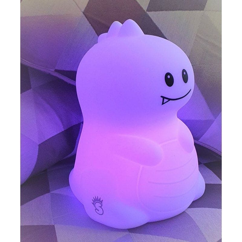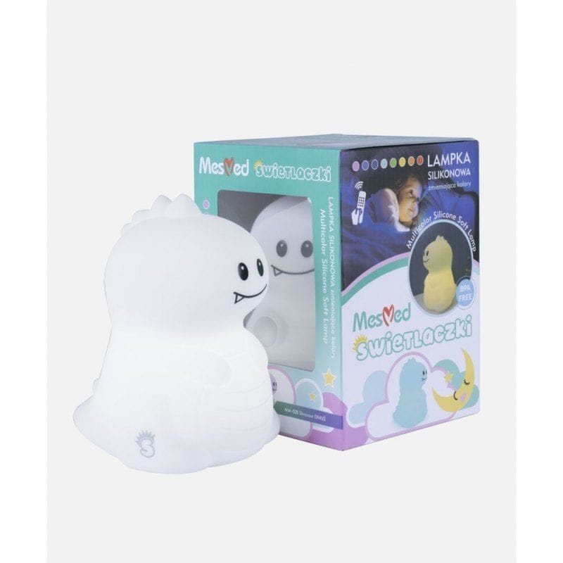 MesMed silicone lamp with remote control color-changing LIGHT DINO.Soft to the touch silicone bedside lamp is the perfect lighting for a child's room - it will gently illuminate the darkness and fill the bedrooms of the little ones with colors.HygienicAn important advantage is the ease of cleaning the bedside lamp, so it is very easy to keep it clean.Helpful for falling asleepPutting your baby to sleep has never been so easy. The skylight has 3 modes of illumination in 8 pleasant and soft colors, which will easily soothe a child who is afraid of the dark. If so far it has been a challenge for your child to go to sleep and stay in bed, falling asleep won't be a problem since they can hold the soft and adorable Dino.Peaceful sleepThe LED lamp creates a fabulous, soothing, mood by lighting up the room with warm colors. The toddler will feel safe, which will ensure a peaceful sleep in the dark and allow parents to sleep peacefully.Gentle lightRecommended when you need illumination for night changing and feeding - gentle light does not arouse the baby. The soft silicone lamp has adjustable light intensity.Friendly toyThe interesting shape of the animal means that the lamp can also be a toddler's best friend and toy. The baby lamp is pleasant and soft to the touch.Travel companionThe toddler can take the Shining Light with him anywhere the lamp is designed in the perfect size to hold in his hand. It is durable and shockproof. It can be used as a lantern.Supports baby's developmentThe baby and toddler lamp has a positive effect on the development of the sense of sight and touch.