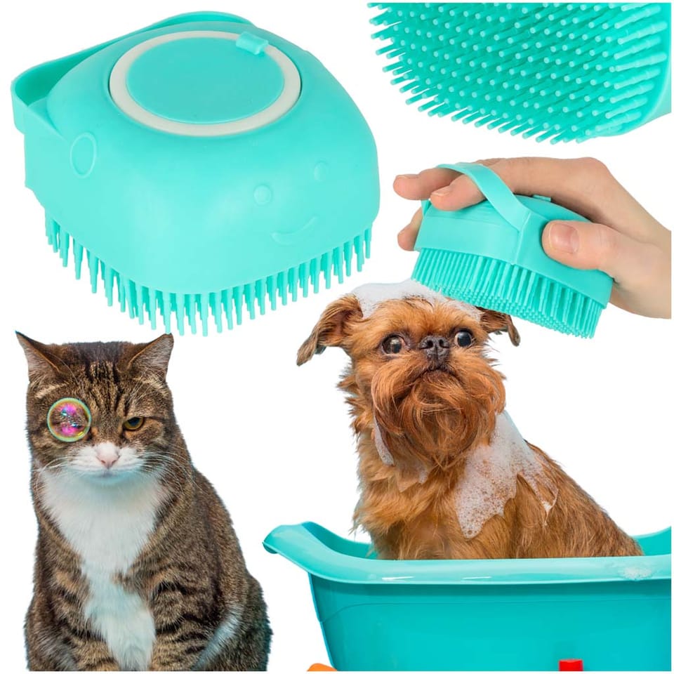 Silicone brush with shampoo dispenser for washing animals.