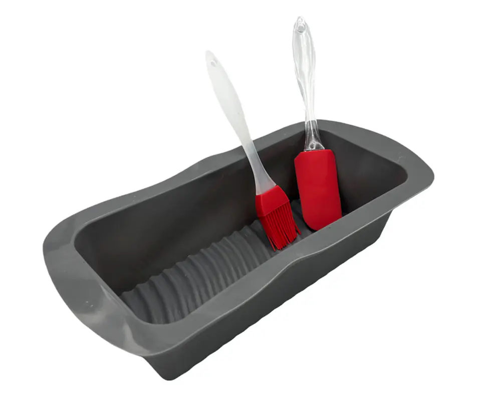 Silicone mold for baking bread, cake, pâté. Includes silicone spatula and silicone brush. Sets in color mixes.