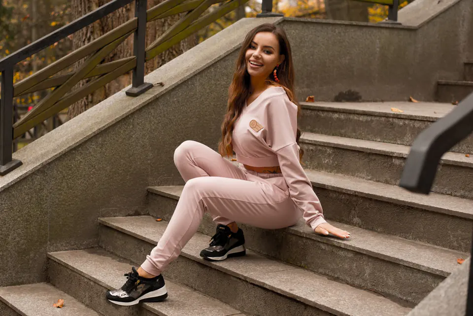 Comfortable, smooth, cotton tracksuit perfect for spring. With a shorter sweatshirt that sexily exposes the navel. V-neckline, with the possibility of falling on one shoulder. Long pants, finished with welts. Soft rubber at the waist. Pockets on the sides. Composition: 95% cotton, 5% elastane.