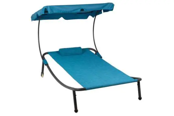 Single garden deckchair with Divero roof The deckchair will be useful during a holiday by the water, on the plot or in your garden. Durable frame and stability will provide you with high comfort of lying. To perfectly match the sun lounger to your needs and the position of the sun, it has been equipped with 2 wheels, which allows you to carry it with one hand. Technical specifications: dimensions: 202 x 139 x 152 cm, dimensions of the lying area: 200 x 100 cm, height from the floor: 47 cm, Pillow dimensions: 48 x 23 cm, Roof size: 115 x 148 cm, Lying surface material: Textilene 670 g, Roof material: polyester 220 g, Color: blue, Frame: steel pipe grey 45 cm, Load capacity: 100 kg.