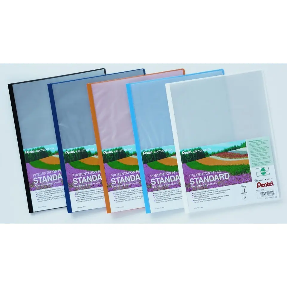 PRESENTATION WORKBOOK Standard_Presentation File presentation Standard__Skoroszyt with a transparent cover, allowing you to personalize your prezentacji.__- Lightweight, flexible and comfortable to użyciu_- Available in 3 capacities: 7, 10 and 15 kieszeni_- The ability to create your own, easily recognizable eye adki_- Made of over 50% raw materials wtórnych__DCP1407 available in 5 colors: black, blue, yellow, cyan, white _Format paper: A4_Wymiary (mm): 305x230x1_Ilość of the bay: sales 7_Jednostka: 5szt_Opakowanie: 10 units Sprz._Opakowanie collective: 30pack.