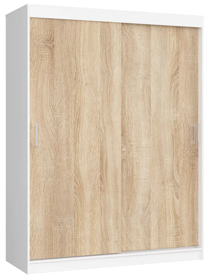 The large wardrobe CLP MONO is made of furniture board covered with laminate in two colors. The body of the furniture is white, while the two sliding doors perfectly imitate the coloring and grain of Sonoma oak. The finish of the cabinet is matte, and the excellent condition of the furniture edges is ensured by ABS veneer used in the most vulnerable areas of the cabinet. The door running system consists of aluminum profiles, ensuring comfortable and long-term use. The interior of CLP MONO has been divided vertically into two parts. The left column consists of capacious, wide and deep shelves, while in the right from the top there is a partition forming a single shelf, and under the shelf – a clothes rail.