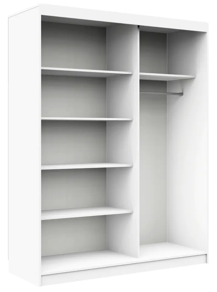 The large CLP MONO wardrobe with a mirror is made of laminated furniture board em in two colors. The white body of the furniture contrasts with the dark doors in wenge wood. However, the sliding doors are not entirely covered with laminate. They have been designed in such a way that the central part of the fronts is a mirror pane, which gives the furniture lightness and provides the room with optical enlargement. The interior of the cabinet is divided into two vertical parts. The left one has 5 wide and deep shelves, and the right one – 1 shelf at the top of the wardrobe and a clothes rail mounted under it.