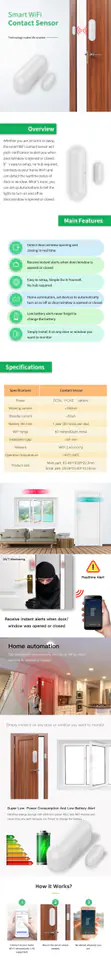 Whether you're at home or away, the smart Wi-Fi sensor will send you a notification to alert you when a door or window is opened or closed. It is easy to set up, connects to your home Wi-Fi and detects the status of a door or window in real time.