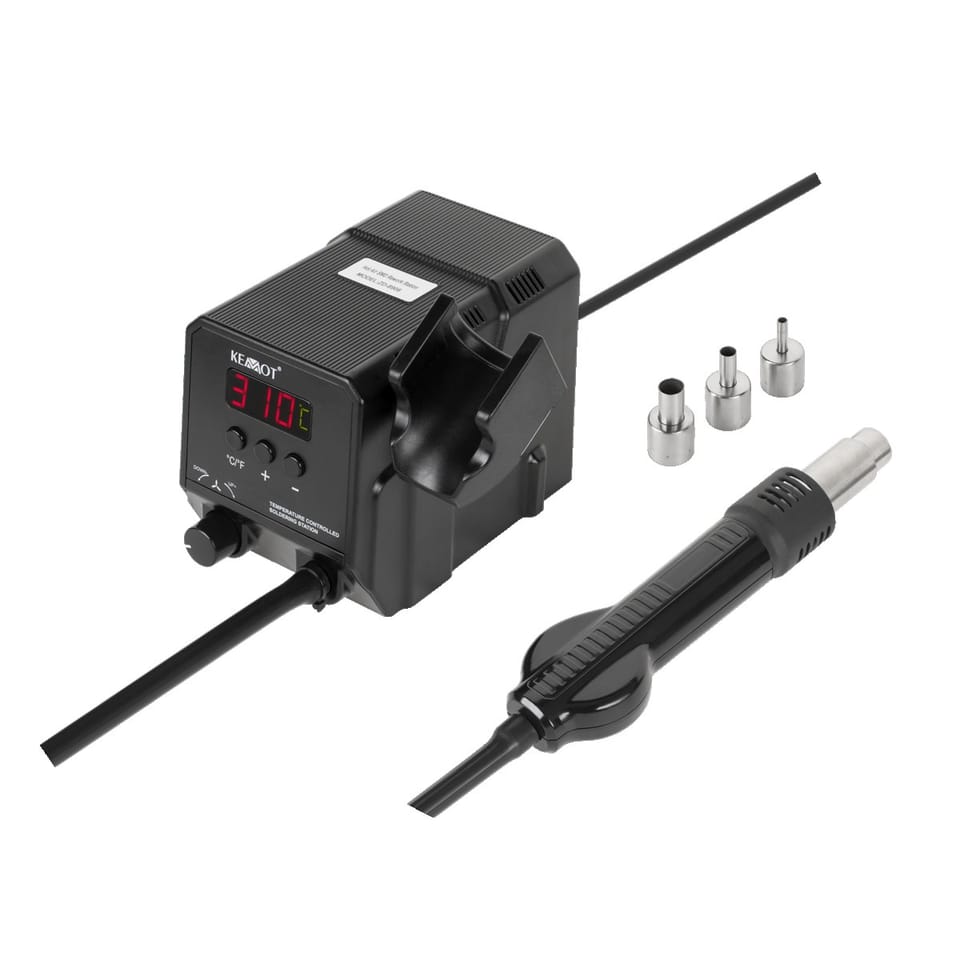 AC power supply: 220~240 V, 50/60 Hz Power: 300 Watt Power saving: auto-standby function Air temperature: 100°C–500°C Dimensions: 125x110x155 mm Weight: 1.2 kg 3 different tips LED display included