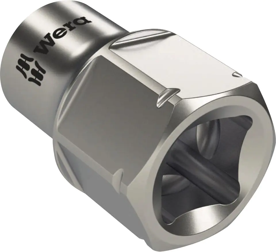 Made of chrome-vanadium steel, chrome-plated, with ball retainer groove. Very low, ideal for tight spaces. With drive with inner quadrangle and outer hexagon (wrench size 11 mm).