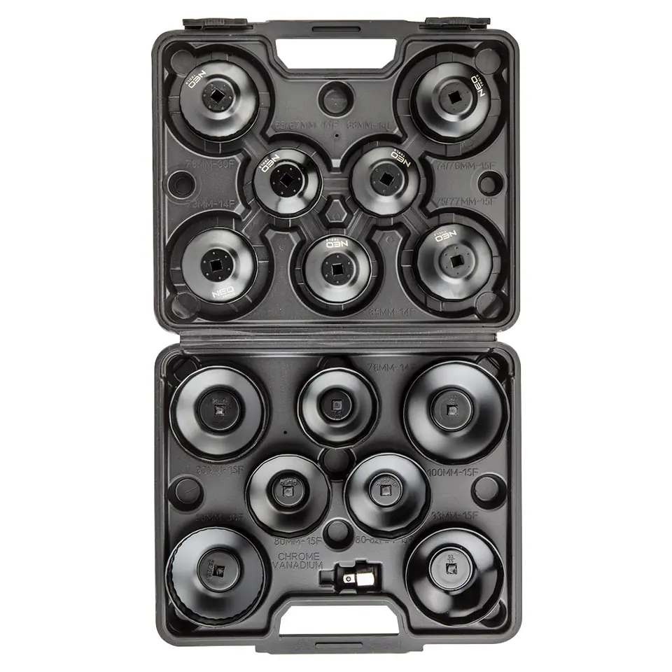Socket wrenches for oil filters - a set of 16 pcs. NEO for professional garages and car services and for advanced amateurs. A set of socket wrenches with a cup design. They are used to unscrew metal oil filters in cars. In addition to the keys, the set also includes a reduction in the range of 3/8 to 1/2. The set is in a special suitcase, each of the elements has a signed place, which makes it easy to maintain order and quickly find the cap you need.