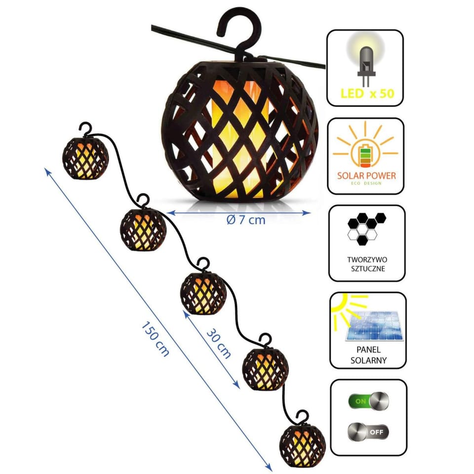 Lamps solan garden fireballs diameter 7 cm This incredibly decorative solar lamps will perfectly decorate and gently illuminate your pond, fountain or pond. The lamp is powered by solar energy, which means no unnecessary cables tangling between the trees and, of course, no electricity costs at all! An additional advantage of this lamp is that it automatically turns on after dark, so you don't have to worry about whether your garden is beautifully lit up in the evening - with our solar lamps it will always be! Parameters: • Battery: 1x 1.2V 400 mAh Ni-Mh • Product size: diameter 7.0 cm Cable length: 2 m Gap between laps: 30 • LED: 10 pieces, SMD flame, total 5 balls 50 ztuk diod diodes • Material: plastic (PP) • Switch: ON/OFF notes: Battery included in the set for free - not subject to complaint. Usually, it is already charged, but it may happen that it will require recharging in the charger.