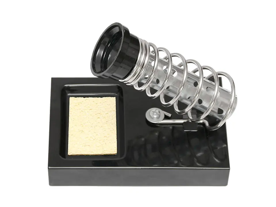 High quality metal stand for flask soldering iron with quick and easy assembly. The stand has been made in such a way as to ensure the stability of the devices. A sponge for cleaning the tips was also included in the set.