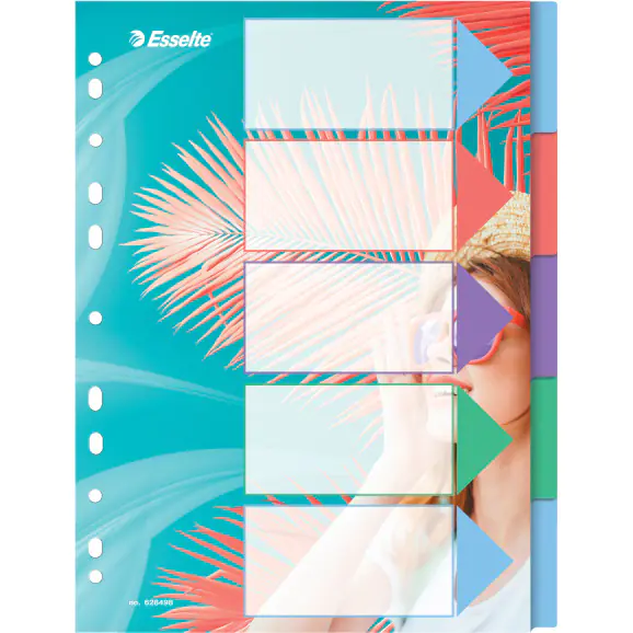 Choose the cheerful colours of nature and create a positive workspace with products from the Esselte Colour'Breeze collection. They are designed to keep you organized and motivated while studying or working, and their modern finish and relaxing colours will make you dream of your next adventure. Strong and durable Esselte Colour'Breeze A4 spacers with indexes, for organizing documents in lever and ring binders. 5 different colored spacers made of translucent polypropylene, with numerical indexes, make it easier and faster to sort and search documents. The front card is made of cardboard and has plenty of space for titles and content descriptions. Available in sets from 5 to 20 spacers and finished with a modern embossed Colour'Breeze pattern. Feel a breath of fresh air in your life!