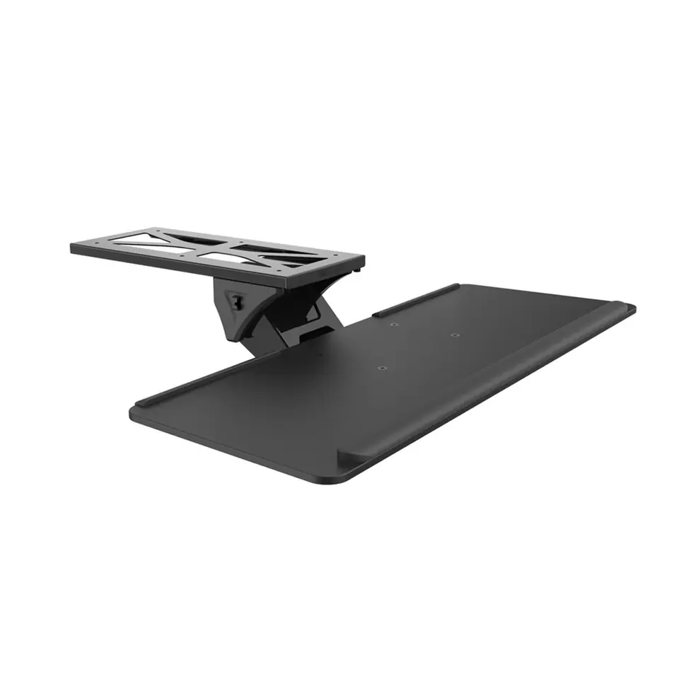 Ergonomic shelf for spacetronik keyboard. The desk keyboard shelf is a new type of product with an ergonomic design that aims to satisfy the need for comfortable typing and adapt to different user habits. It can reduce physical fatigue during prolonged typing. The SPB-111B is fully adjustable, allowing the keyboard to be positioned correctly. Relax your wrists by adjusting your height and slope and avoid the symptoms of muscle strain and improve your work experience. From now on, a narrow table top will not be a problem. Get more workspace on your desk. When the handle is not in use, it can simply be slipped under the desk to save space. Quick and easy installation.