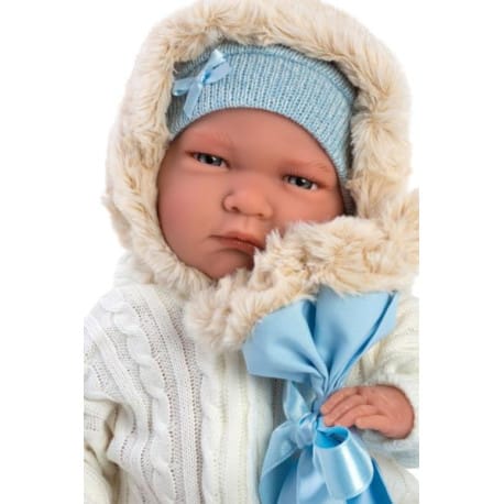"Made in Spain, the realistic 42 cm bobas doll by Llorens is a unique toy for children of all ages. Lalo is dressed in a white sweater rampers with a fur hood and a hat. The garment is fastened on the stomach with velcro, which makes it easier to dress the baby. The set includes a car seat and a rag cuddly toy. The fabric belly of the doll is filled with soft padding, when pressed on it, the doll will begin to cry. This wonderful, slightly swollen face will love every child. Lalo has blue eyes, long eyelashes, and a sweet little nose. The eyes are open permanently, do not close. The handles and legs are movable, so we can easily arrange the doll as we want. The doll was packed in a decorative cardboard box. The attached teat performs a decorative function. We love Spanish Llorens dolls!" 74077