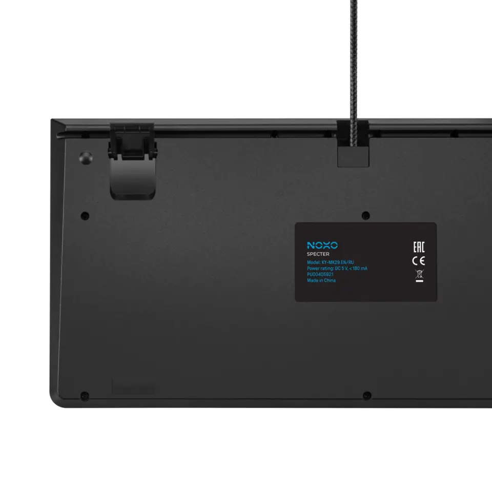 Compact TKL size NOXO Specter is a TKL (TenKeyLess) keyboard, i.e. it does not have a numeric block), practically unused in games. This gives you more room for your mouse, which is especially important on smaller desks. It has 87 keys. Multimedia functions are achieved by pressing the FN key. OUTEMU BLUE mechanical microswitches The keys are based on durable blue OUTEMU BLUE mechanical switches, which have a perceptible and audible click. They provide very fast response time and durability for up to 60,000,000 strokesDurable inscriptions on the keysGamers use keyboards very intensively. During long hours of games, the keys are hit very often and the inscriptions on them must be durable. Therefore, the characters have been introduced into individual keys using the double-injection method, thanks to which the inscription is an integral part of the whole key and will not wear off even as a result of intensive use. Multi-colored key backlight (rainbow) Glare on the screen makes it difficult to play, so it's most convenient to play with the lights off. The keyboard is equipped with multicolored, rainbow backlighting of keys (Rabbis) with adjustable brightness and exciting visual effects and ready-made sets of backlight settings. It provides discreet illumination of the keys and definitely enhances the look. Gaming Mode During a game, any accidental press of the WINDOWS key may cause the game to stop. The keyboard allows you to activate the gaming mode, in which the WINDOWS key is deactivated. Braided cable The gaming keyboard is designed for heavy use, so the cable needs to be very durable. The USB cable of this keyboard has been covered with a protective braid, making it more resistant to damage, creases and abrasion. Additional features A special place for convenient placement of your smartphone or tablet at the right angle. Cable management system in the form of guides on the bottom of the keyboard body. Integrated ergonomic palm rest.