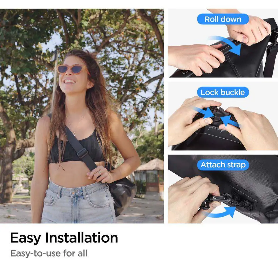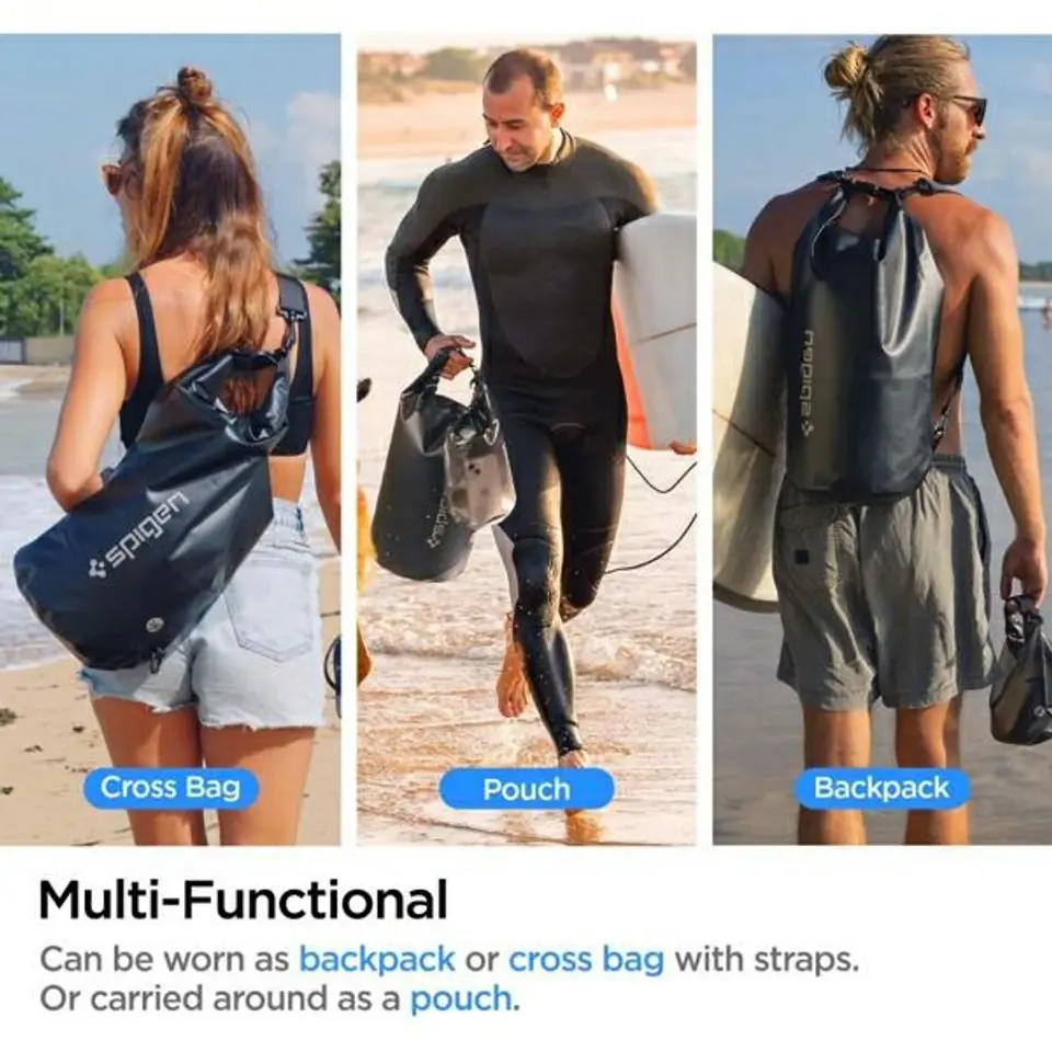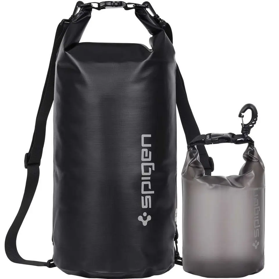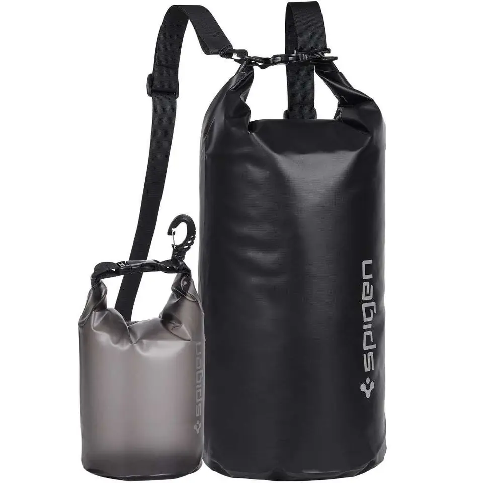 Functional set of two waterproof bags (20L and 2L) A630 from Spigen. Thanks to their lightweight and waterproof construction, they are ideal for water sports, hiking or camping. The double locking system ensures that the items left inside will remain protected against the effects of flooding.