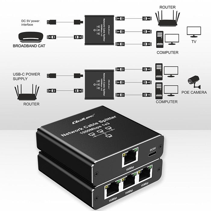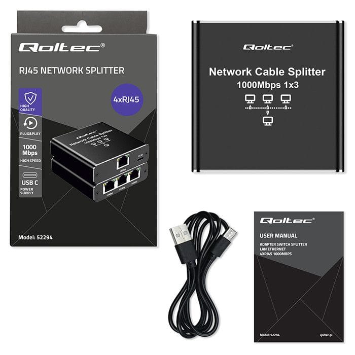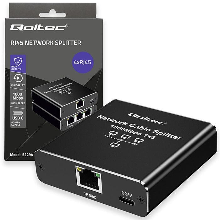 Discover the full potential of your networkA reliable and efficient network device that will allow you to split the Ethernet signal into 3 outputs at a transmission speed of 1000 Mb/s. The device will provide you with a stable and fast connection and smooth data transmission over a distance of up to 100 meters. This functionality allows you to uniquely expand the possibilities of using and enjoying your multimedia system, without the need for additional complex solutions or costly investments In additional equipment. Now you can enjoy your favorite movies, video games or presentations on several receivers at the same time.Robust metal construction, advanced features and ease of useDiscover new possibilities with a Qoltec device that offers: