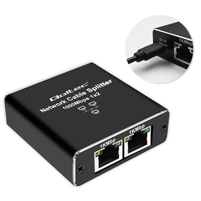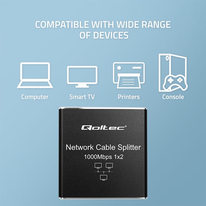 Discover the full potential of your networkA reliable and efficient network device that will allow you to split the signal into 2 outputs at a transmission speed of 1000 Mbps. The device will provide you with a stable and fast connection and smooth data transmission over a distance of up to 100 metres. This functionality allows you to uniquely expand the possibilities of using and enjoying your multimedia system, without the need for additional complex solutions or costly investments in additional equipment. Now you can enjoy your favourite films, video games or presentations on several receivers at the same time. Functionality always at handDiscover new possibilities with a Qoltec device that offers:- Signal distance up to 100m,- Equipped with 3 RJ45 ports (1 x Input, 2x Output)- Data rates up to 1Gbps,- Aluminium housing, gold-plated connectors and reinforced PCB- Works with CAT 5, 5e, 6 network cables. Expand your multimedia capabilitiesOur device offers instant and trouble-free installation, thanks to Plug&Play technology, which requires no additional configuration or technical expertise. Just a few simple steps are required. Firstly, connect the devices to the appropriate RJ45 ports using the appropriate network cables and then connect one of the ports to your router or access modem. Make sure the LEDs on the switch indicate activity on the ports.