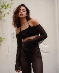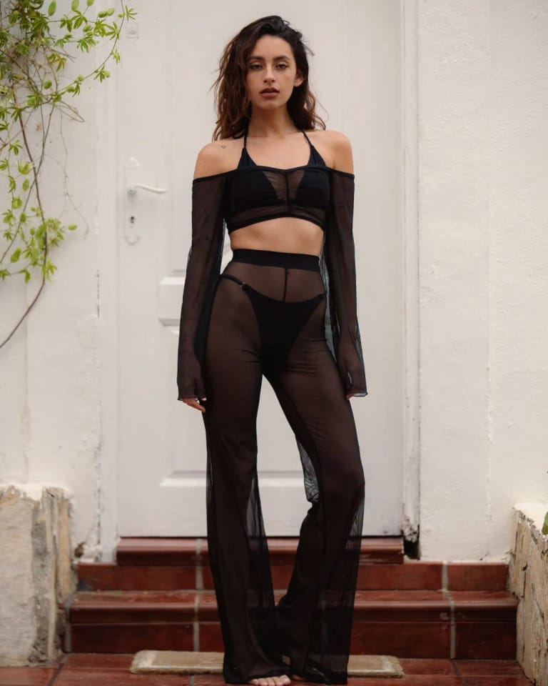 Model Elia to propozycja dla kobiet, które cenią sobie subtelność i nowoczesny charakter. Spodnie zostały uszyte z delikatnej, prześwitującej siateczki, która pięknie dopasowuje się do sylwetki i eksponuje ciało w wysmakowany sposób. Lekko rozszerzone nogawki i długość sięgająca kostek nadają im płynności i komfortu, a złote detale wprowadzają elegancki akcent.
