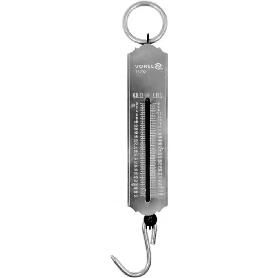Spring scale with a lifting capacity of up to 50 kg, marked on a scale every 0.5 kg.